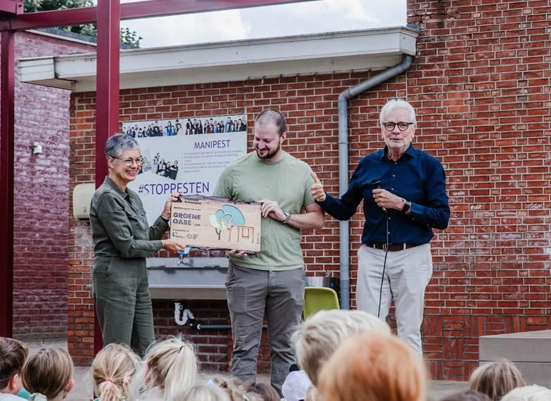 Op 4 september 2025 werd onze vergroende speelplaats feestelijk ingehuldigd. Er werd 740m² onthard en getransformeerd tot een buitenruimte vol groen en spelelementen. Gedeputeerde Jan De Haes overhandigde het label 'Groene Oases' en feliciteerde onze school met het mooie resultaat. Het project 'Groene Oase' is een initiatief van provincie Antwerpen om scholen financieel te ondersteunen bij het ontharden en vergroenen van speelplaatsen. Regionaal Landschap Rivierenland zorgde voor advies en begeleiding.